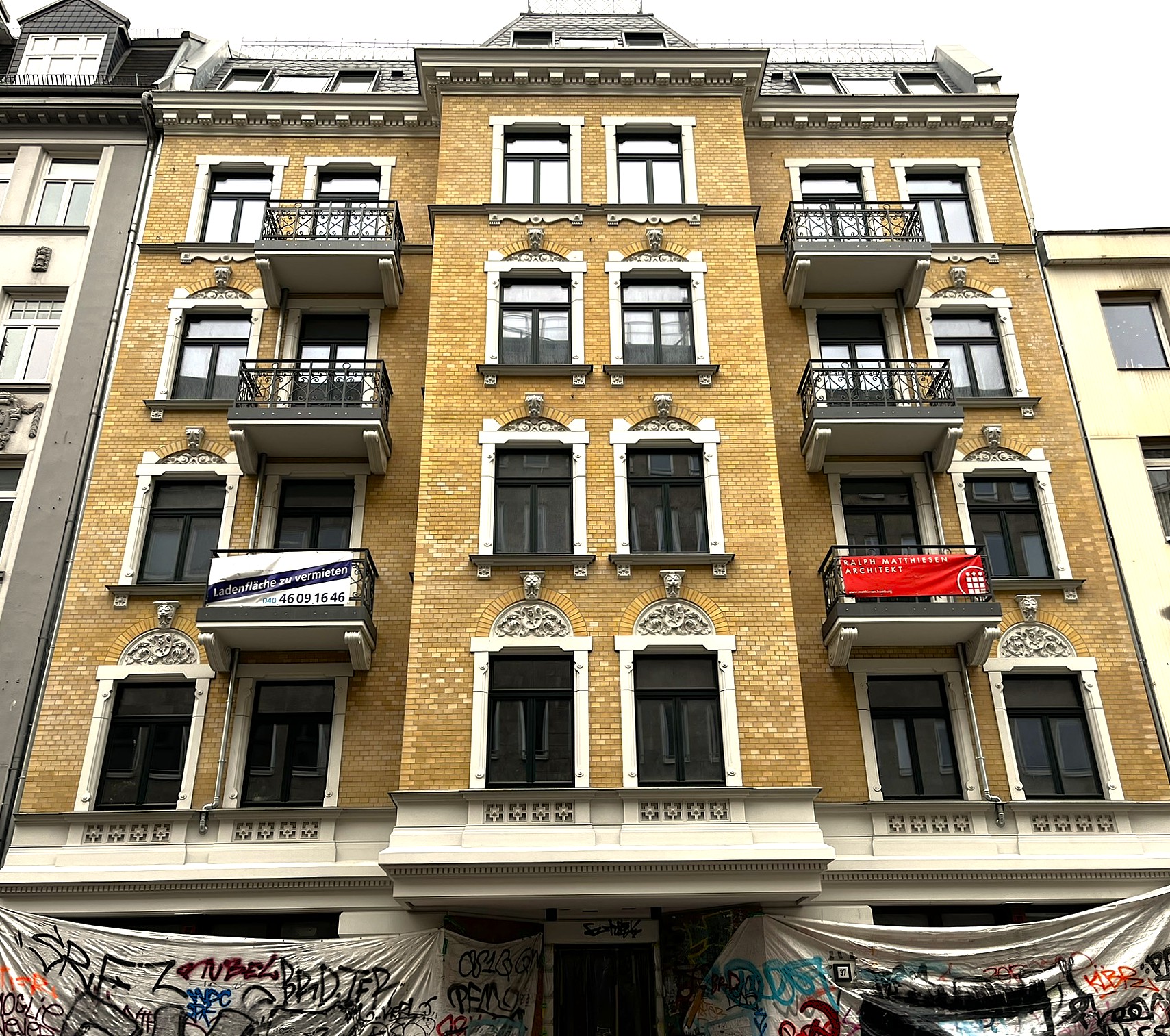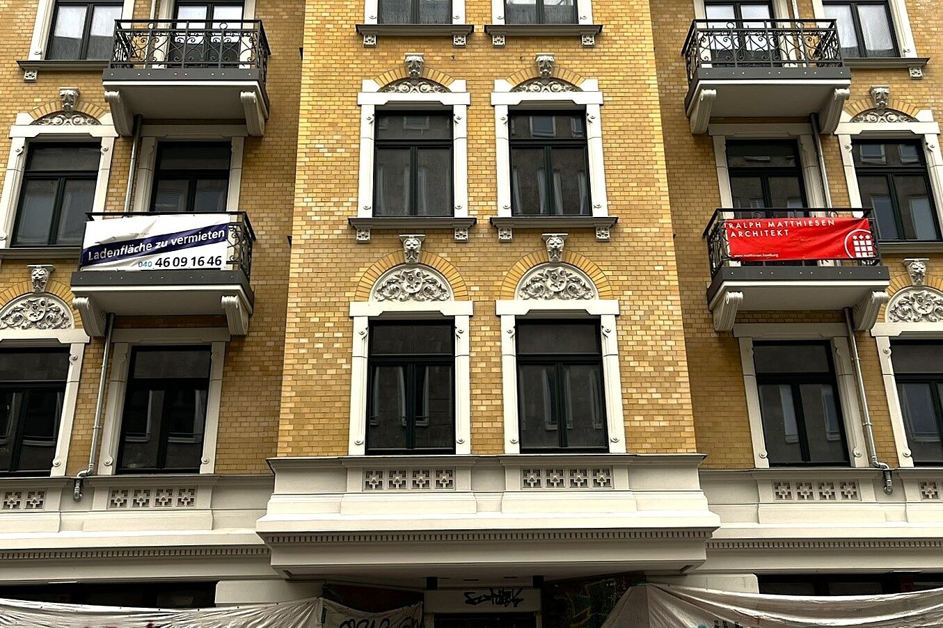 Es gibt keine genuin rechte Archi­tek­tur, aber offen­sicht­lich gibt es Archi­tek­tur, die Kon­ser­va­ti­ven und Rech­ten gefällt. Ein Bei­spiel dafür fin­det sich seit eini­ger Zeit unweit der Roten Flora, am Schul­ter­blatt 37–39. Wo viele Jahre eine Bau­lü­cke klaffte, steht seit etwas mehr als zwei Jah­ren wie­der ein Wohn­haus. Durch seine grün­der­zeit­li­che Archi­tek­tur wirkt es, als bli­cke seine Fas­sade bereits seit der Jahr­hun­dert­wende über das Kopf­stein­pflas­ter. Es ist jedoch, wie gesagt, ein Neubau.