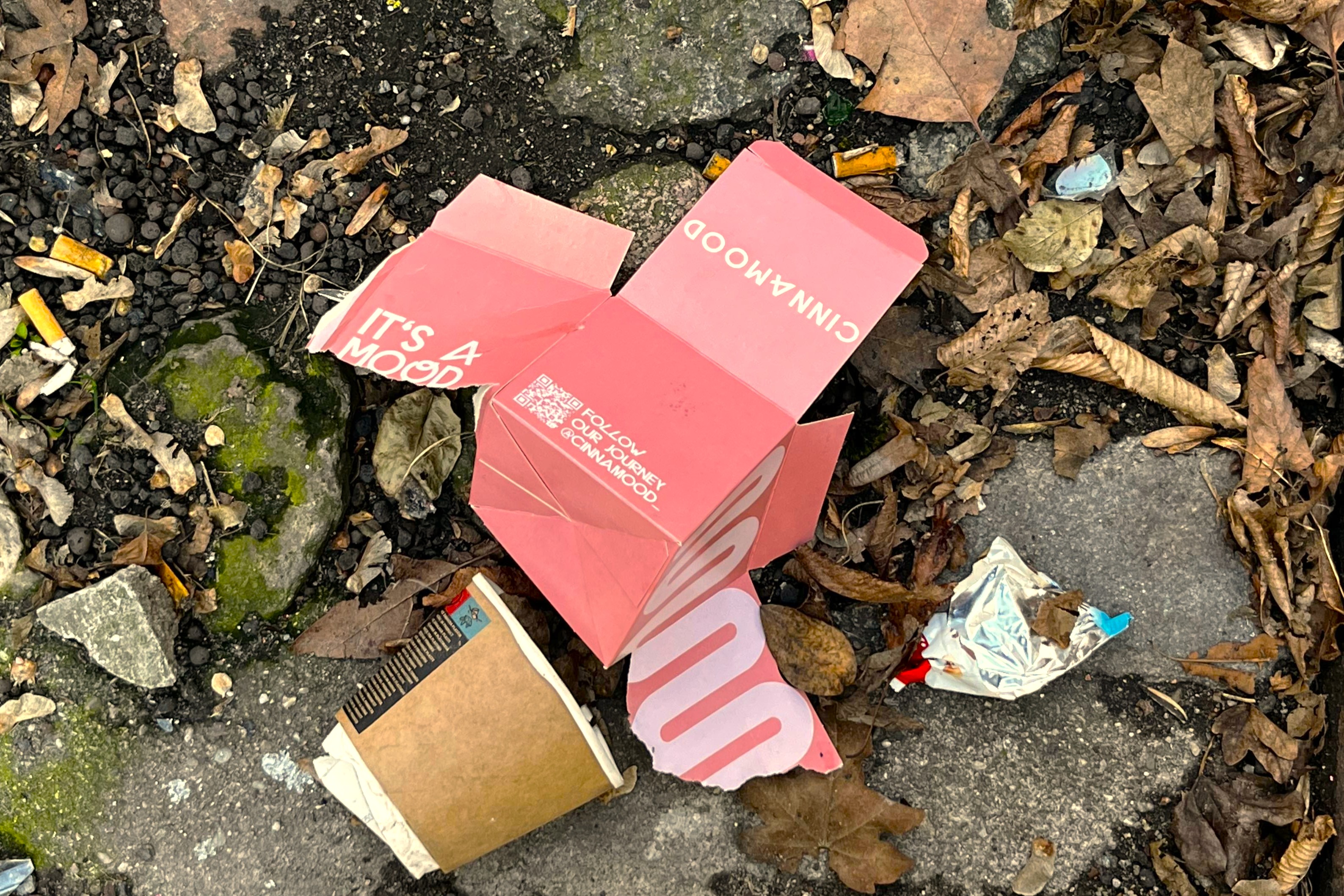 It’s a mood – weg­ge­wor­fe­ner Papp­kar­ton einer Zimt­schne­cken­kette in der Stern­schanze. Foto: privat.