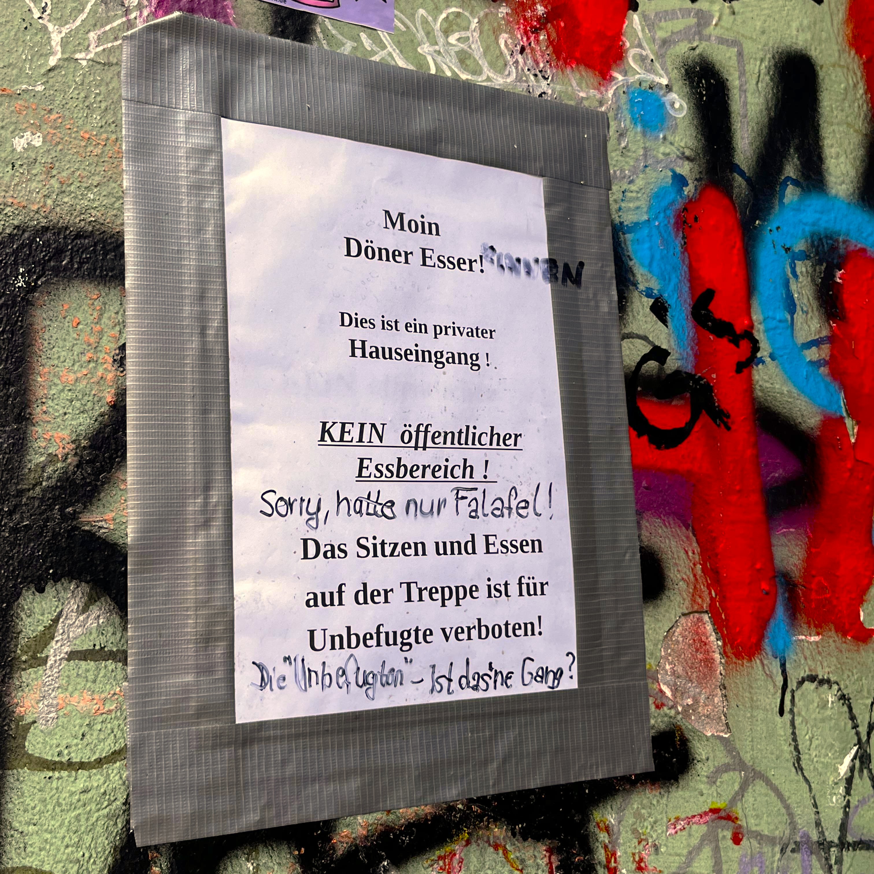 Auch ihnen schmeckt es nicht – Schild generv­ter Anwohner:innen gegen­über von »Hakan Abi«. Foto: privat.