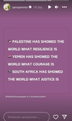 Ibrahims Twitter-Profil ist seit dem 14. Januar auf ›privat‹ gestellt. Aber auch auf ihrem weiterhin öffentlichen Instagram-Profil ist sie aktiv. Am 15. Januar teilte Ibrahim in ihrer Instagram-Story etwa ein Bild mit dem Spruch: »Palestine has showed the world what resilience is. Yemen has showed the world what courage is. South Africe has showed the world what justice is.« Was genau mit der »palästinensischen Resilienz« gemeint ist, ist hier offen gelassen. Mit dem »Mut« des Jemen ist in diesem Zusammenhang aber unmissverständlich der Terrorismus der vom Iran finanzierten Huthi-Rebellen gemeint.